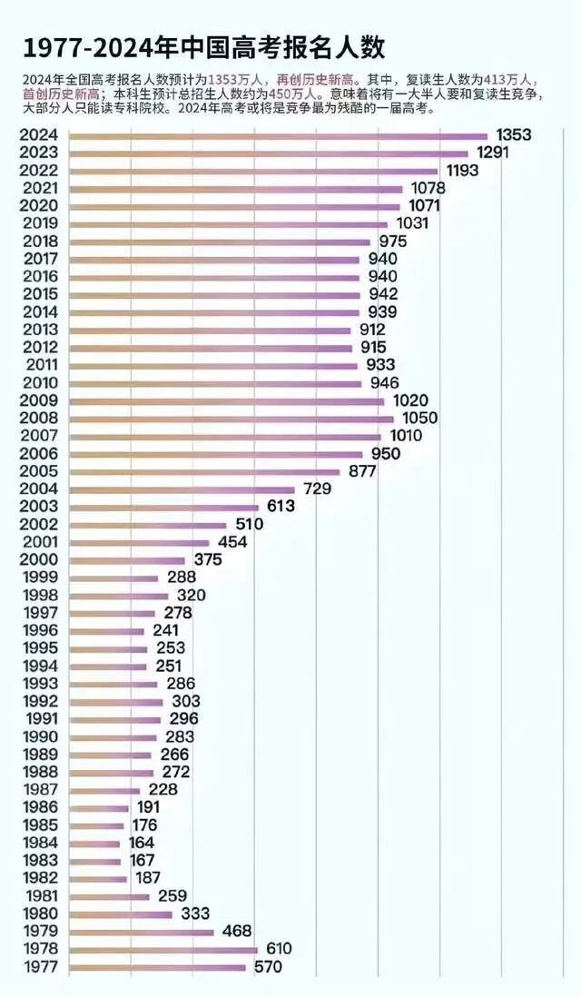 根据网上公布的数据显示:2024年全国高考报名人数为1353万人,比2023年多出62万人,再次创下历史新高!