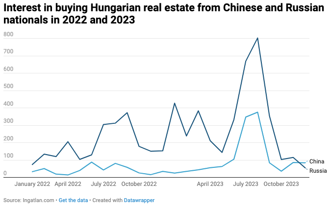 2022 年,有 504 名中国人和 2242 名俄罗斯公民向他们咨询,2023 年,有 1342 名中国人和 3842 名俄罗斯人有兴趣在匈牙利购买房产。至于 2024 年,该公司仅发布了 1 月份的最终数据,但这也表明俄罗斯占据主导地位:每 851 个来自俄罗斯公民的询问中,只有 66 个来自潜在中国买家。