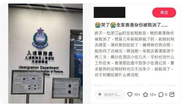 今年5月,《香港01》报导指,有内地博主在小红书以「哭了,全家香港身份被取消了…」为题发文,指有一名「浙江ip的宝爸」告诉他,其香港身份证被取消了。