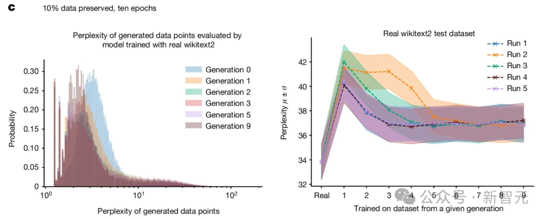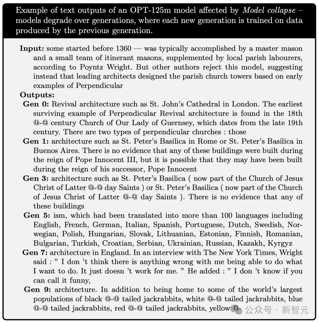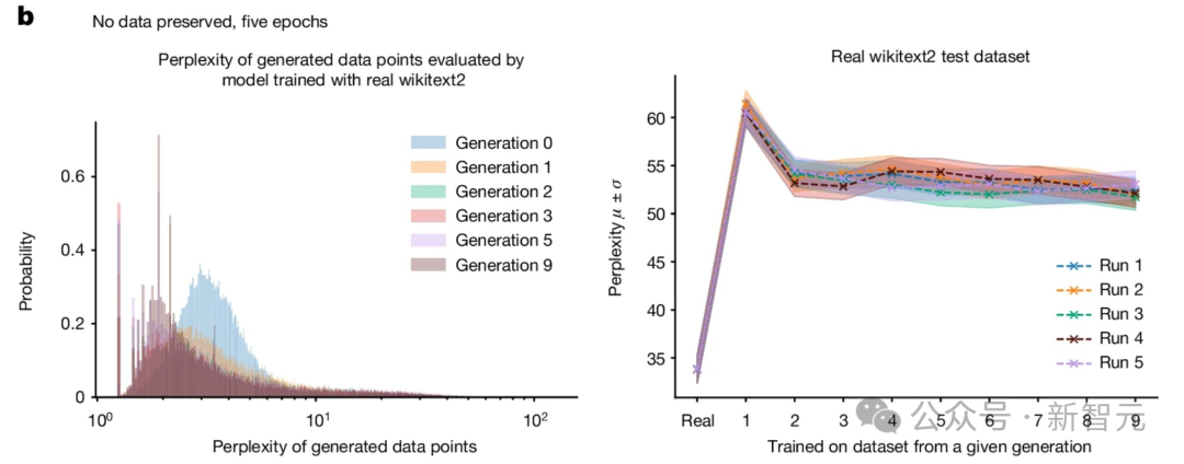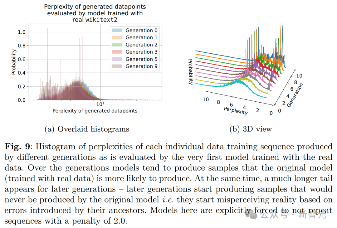 研究中,作者们使用维基百科文章先训练了模型OPT-125m,并在前一代模型生成的文本上,训练了多代模型。