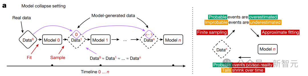 简单讲,LLM生成的数据最终污染了下一代模型的训练集,就会出现「模型崩溃」(model collapse)的现象。