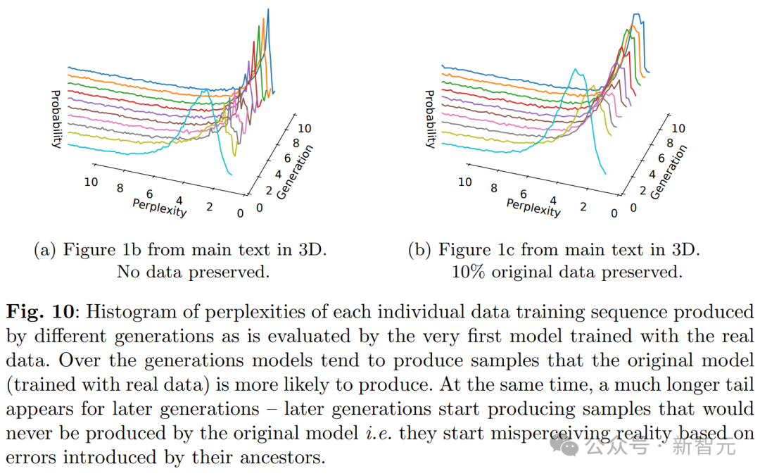 特别是,从图下及其3D版本中可以看到,模型崩溃现象确实发生了,因为低困惑度样本的密度随着训练代次的增加而开始累积。