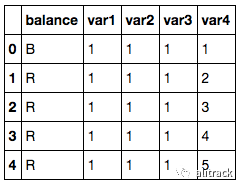 import pandas as pdimport numpy as np# Read datasetdf = pd.read_csv('balance-scale.data', names=['balance', 'var1', 'var2', 'var3', 'var4'])# Display example observationsdf.head()