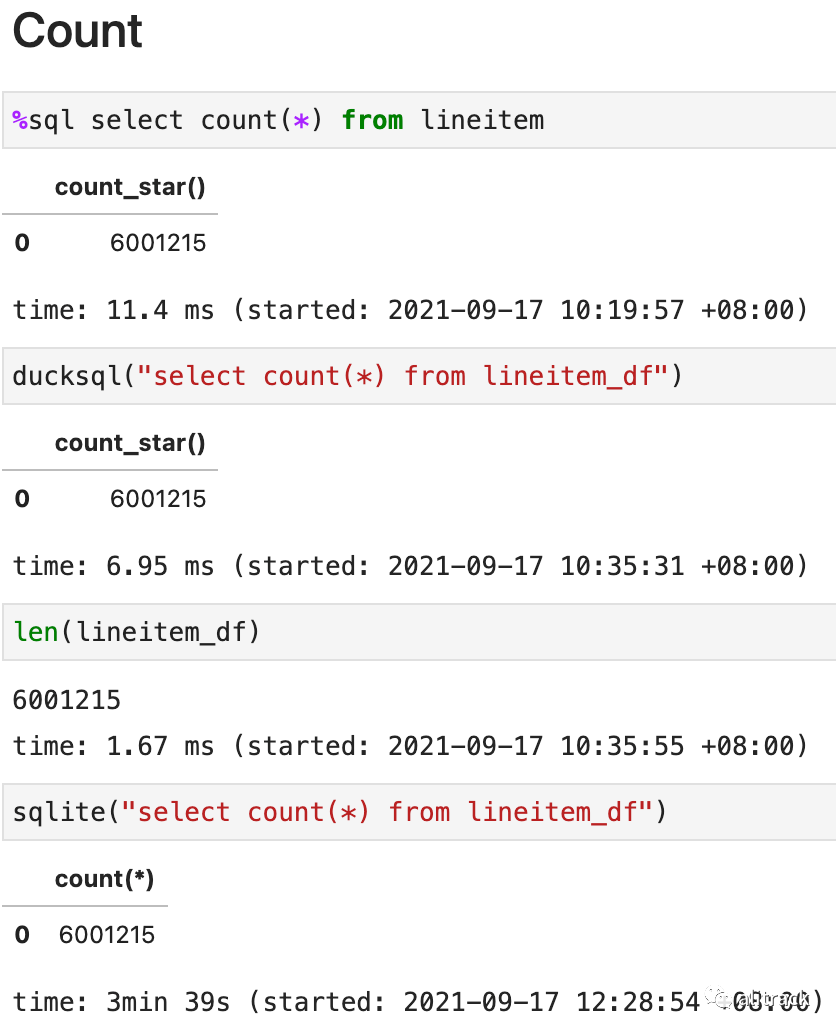 为了方便理解,做了三种方法的对比, 分别为直接对 DuckDB 的表(视图)进行 SQL 操作、Pandas API 以及把 Pandas DataFrame 当做表,通过 SQL 操作。