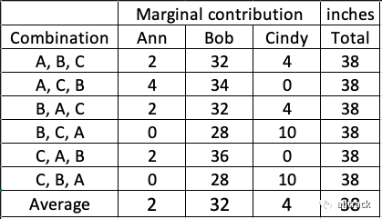 如何回答这个问题?我列出了所有排列并得出了表 A 中的数据。(有些人问我如何得出这个表。请参阅文章末尾的注释。)当顺序是 A、B、C 时,三者的边际贡献分别为 2、32、4 英寸。