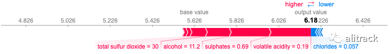 酒精:对质量评级有积极影响。该酒的酒精度为 11.8(如表 B 第一行所示),高于平均值 10.41。所以它把预测推到了右边。