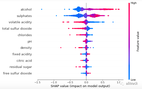 相关:一个高的“酒精”含量水平具有较高的和积极的质量等级的影响。“高”来自红色,“正面”影响显示在 X 轴上。同样,我们会说“挥发性酸度”与目标变量负相关。