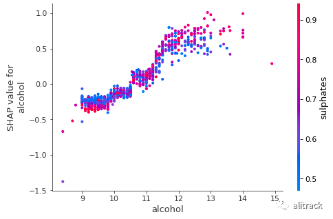 您可能会问如何显示部分依赖图。部分依赖图显示了一个或两个特征对机器学习模型的预测结果的边际效应 ( JH Friedman 2001[20] )。它告诉目标和特征之间的关系是线性的、单调的还是更复杂的。为了创建依赖图,您只需要一行代码:shap.dependence_plot(“alcohol”, shap_values, X_train). 该函数会自动包含另一个与您选择的变量交互最多的变量。下图显示“酒精”与目标变量之间存在近似线性的正趋势,“酒精”与“硫酸盐”频繁相互作用。