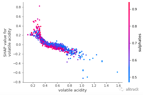 假设你想知道“挥发性酸度”和它相互作用最多的变量,你可以这样做shap.dependence_plot(“volatile acidity”, shap_values, X_train)。下图显示“挥发性酸度”与目标变量之间存在近似线性但负相关的关系。这种负相关已经在变量重要性图图表 (K) 中得到了证明。