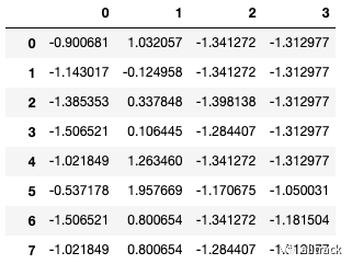 from sklearn.preprocessing import StandardScalervariables = ['sepal length', 'sepal width', 'petal length', 'petal width']x = df.loc[:, variables].valuesy = df.loc[:,['target']].valuesx = StandardScaler().fit_transform(x)x = pd.DataFrame(x)