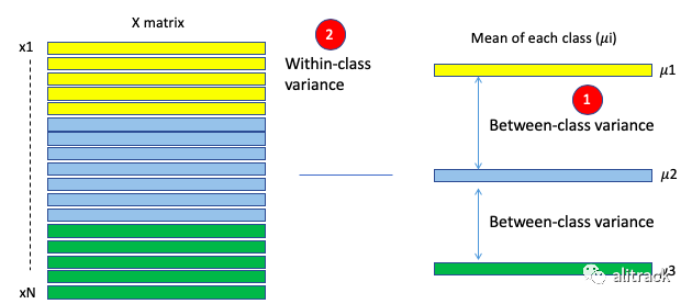 首先,它计算从属变量的不同类别之间的可分离性,称为级别方差,如(1)所示。
