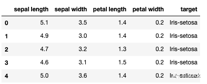 # Use the iris dataset to illustrate PCA:import pandas as pdurl = “https://archive.ics.uci.edu/ml/machine-learning-databases/iris/iris.data"# load dataset into Pandas DataFramedf = pd.read_csv(url, names=['sepal length','sepal width','petal length','petal width','target'])df.head()
