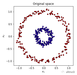 print(__doc__)import numpy as npimport matplotlib.pyplot as pltfrom sklearn.decomposition import PCA, KernelPCAfrom sklearn.datasets import make_circlesnp.random.seed(0)X, y = make_circles(n_samples=400, factor=.3, noise=.05)plt.figure(figsize=(10,10))plt.subplot(2, 2, 1, aspect='equal')plt.title("Original space")reds = y == 0blues = y == 1plt.scatter(X[reds, 0], X[reds, 1], c="red",s=20, edgecolor='k')plt.scatter(X[blues, 0], X[blues, 1], c="blue",s=20, edgecolor='k')plt.xlabel("$x_1$")plt.ylabel("$x_2$")