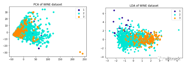 X = wine.drop(columns=['quality','quality2'])y = wine['quality2']target_names = np.unique(y)target_namespca = PCA(n_components=2)X_r = pca.fit(X).transform(X)lda = LinearDiscriminantAnalysis(n_components=2)X_r2 = lda.fit(X, y).transform(X)
