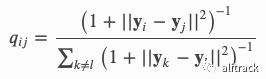 t-SNE 的目标是通过点Yi和Yj之间的低维空间q来匹配上述j和i的条件概率p,如下图所示。概率q遵循长尾 Student-t 分布,这就是 t-SNE 中的T的由来。