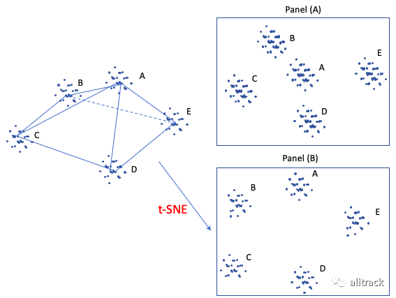 图(C)显示了另一个例子。它是一个三维四面体,数据点聚类在顶点。如果我们只是像 Panel (a)那样将三维图折叠成二维图,它就不能很好地工作,因为组(a)变成了中心集群。相比之下,Panel (B)可能是一个更好的 2d 展示,它保留了 Cluster (a)-(E)之间的距离,同时保留了每个 Cluster 中点的局部距离。t-SNE 是一种非线性降维技术,用于保持局部邻域。如果一组点在 t-SNE 图上聚在一起,我们可以相当肯定这些点彼此很接近。