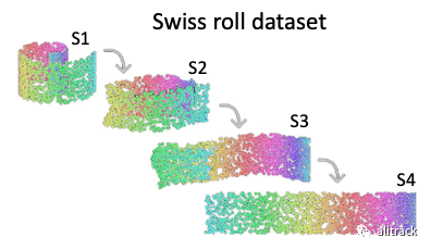 将上述三维瑞士卷呈现为二维的最佳方式是什么?直观地我们希望“展开”瑞士卷到一个平坦的蛋糕。在数学中,它意味着类似的观点将成为附近的点,异常点将成为距离点。