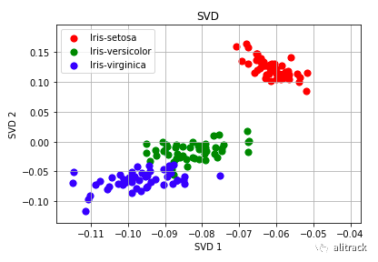 # Add the actual target to the data in order to plot itnewdata['target']=df['target']fig = plt.figure()ax = fig.add_subplot(1,1,1)ax.set_xlabel('SVD 1')ax.set_ylabel('SVD 2')ax.set_title('SVD')targets = ['Iris-setosa', 'Iris-versicolor', 'Iris-virginica']colors = ['r', 'g', 'b']for target, color in zip(targets,colors): indicesToKeep = newdata['target'] == target ax.scatter(newdata.loc[indicesToKeep, 'SVD1'] , newdata.loc[indicesToKeep, 'SVD2'] , c = color , s = 50)ax.legend(targets)ax.grid()