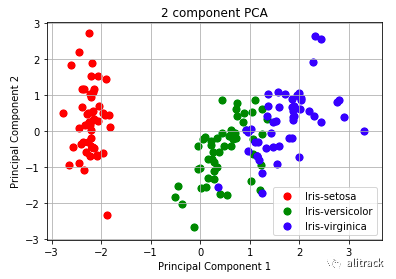import matplotlib.pyplot as pltfig = plt.figure()ax = fig.add_subplot(1,1,1)ax.set_xlabel('Principal Component 1')ax.set_ylabel('Principal Component 2')ax.set_title('2 component PCA')targets = ['Iris-setosa', 'Iris-versicolor', 'Iris-virginica']colors = ['r', 'g', 'b']for target, color in zip(targets,colors): indicesToKeep = x_pca['target'] == target ax.scatter(x_pca.loc[indicesToKeep, 'PC1'] , x_pca.loc[indicesToKeep, 'PC2'] , c = color , s = 50)ax.legend(targets)ax.grid()
