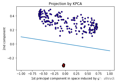 kpca = KernelPCA(kernel="rbf", fit_inverse_transform=True, gamma=10)X_kpca = kpca.fit_transform(X)pca = PCA()X_pca = pca.fit_transform(X)plt.scatter(X_kpca[reds, 0], X_kpca[reds, 1], c="red",s=20, edgecolor='k')plt.scatter(X_kpca[blues, 0], X_kpca[blues, 1], c="blue",s=20, edgecolor='k')x = np.linspace(-1, 1, 1000)plt.plot(x, -0.1*x, linestyle='solid')plt.title("Projection by KPCA")plt.xlabel(r"1st principal component in space induced by $\phi$")plt.ylabel("2nd component")