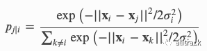 t-SNE 对点之间的相似性进行建模。它是如何定义相似性的?首先,它是由点Xi和Xj之间的欧氏距离定义的。其次,定义为“数据点i与点j的相似度是点i根据高斯分布下的概率选择其他邻居时,将数据点j作为其邻居的条件概率p”的条件概率。在下面的条件表达式中,如果点j比其他点更接近点i,那么它被选中的概率就更高(注意负号)。