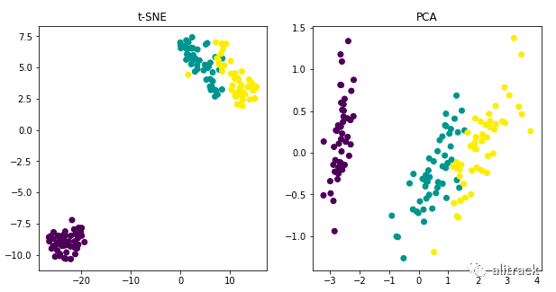 from sklearn.manifold import TSNEfrom sklearn.datasets import load_irisfrom sklearn.decomposition import PCAimport matplotlib.pyplot as pltiris = load_iris()X_tsne = TSNE(learning_rate=100).fit_transform(iris.data)X_pca = PCA().fit_transform(iris.data)plt.figure(figsize=(10, 5))plt.subplot(121)plt.scatter(X_tsne[:, 0], X_tsne[:, 1], c=iris.target)plt.subplot(122)plt.scatter(X_pca[:, 0], X_pca[:, 1], c=iris.target)