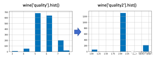 wine['quality2'] = np.where(wine['quality']<=4,1, np.where(wine['quality']<=6,2,3))