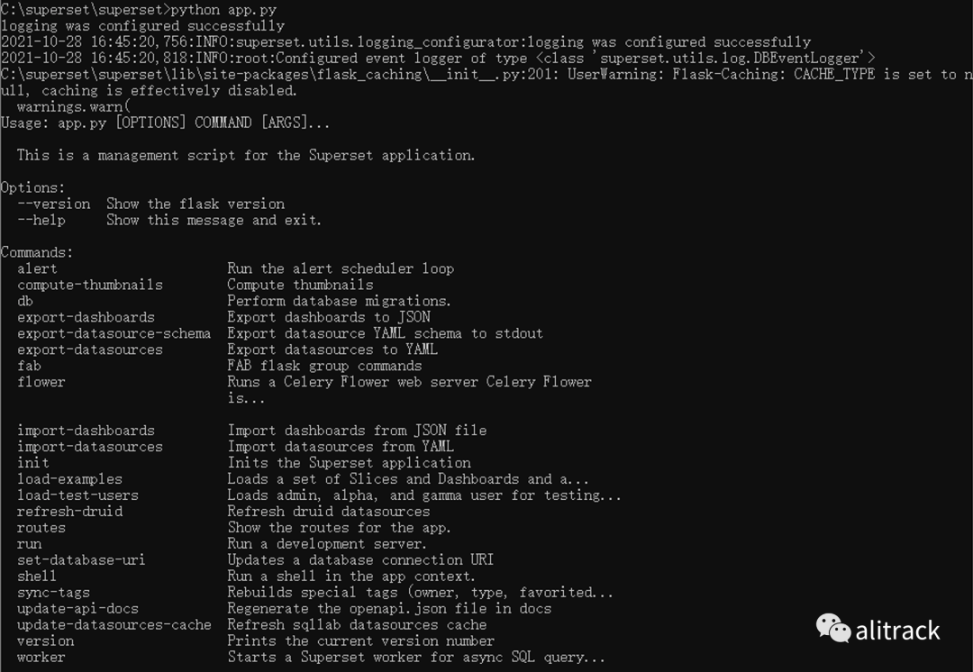 import sysimport osimport pathlibimport refrom sqlalchemy.engine import create_enginefrom superset.cli import supersetdef init(): # 如果superset_config.py 存在,表示已做过初始化 # 如果换了路径,建议删除superset_config.py,重新执行初始化 if pathlib.Path("superset_config.py").exists(): return path =pathlib.Path(__file__).absolute().as_posix() # 修改example数据库路径(需要绝对路径) e = create_engine('sqlite:///superset.db') e.execute(f"update dbs set sqlalchemy_uri='sqlite:///{path}/superset.db'") #superset从superset_config.py 读取数据库连接设置 with open('superset_config.py','w') as file: file.write(f'SQLALCHEMY_DATABASE_URI = "sqlite:///{path}/superset.db"')def main(): init() sys.argv[0] = re.sub(r'(-script\.pyw|\.exe)?$', '', sys.argv[0]) sys.exit(superset())if __name__ == '__main__': main()