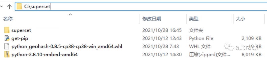 解压缩 python-3.8.10-embed-amd64.zip,并进入 Python 解压缩目录,后续操作均在该目录下(我在c:\superset\superset)