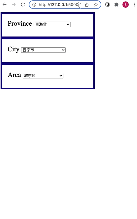 今天就给大家介绍下它的一个应用,不写一行 Javascript 代码,实现省市区 3 级联动的例子,后台可以选择你擅长的,今天我仍然使用 Flask。