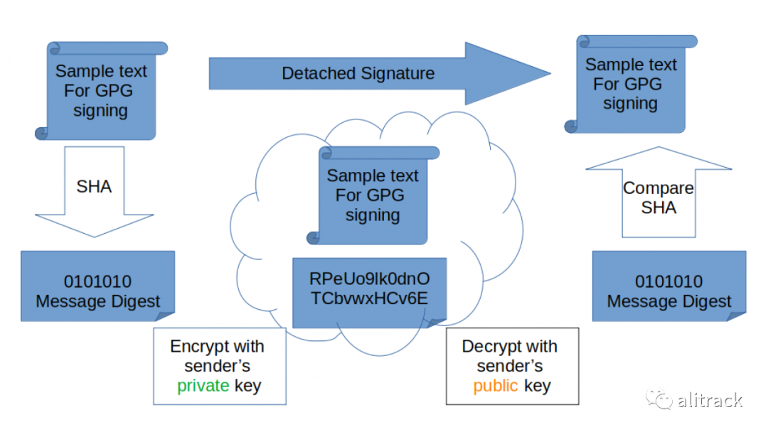 分离签名选项(--detach-sign)可用于为每个人提供在没有公钥的情况下查看消息的选项。如果需要,这将创建一个单独的签名文件,用于验证原始消息。在最简单的形式中,该文件包含原始消息的散列,并使用私钥加密。任何拥有公钥的人都可以打开签名,然后比较哈希值来验证签名文件的完整性。