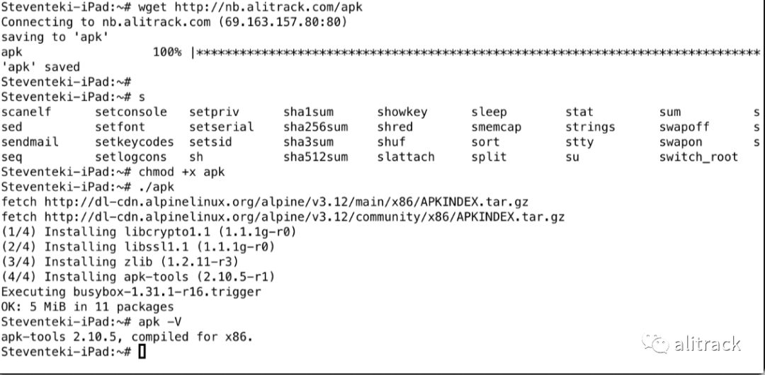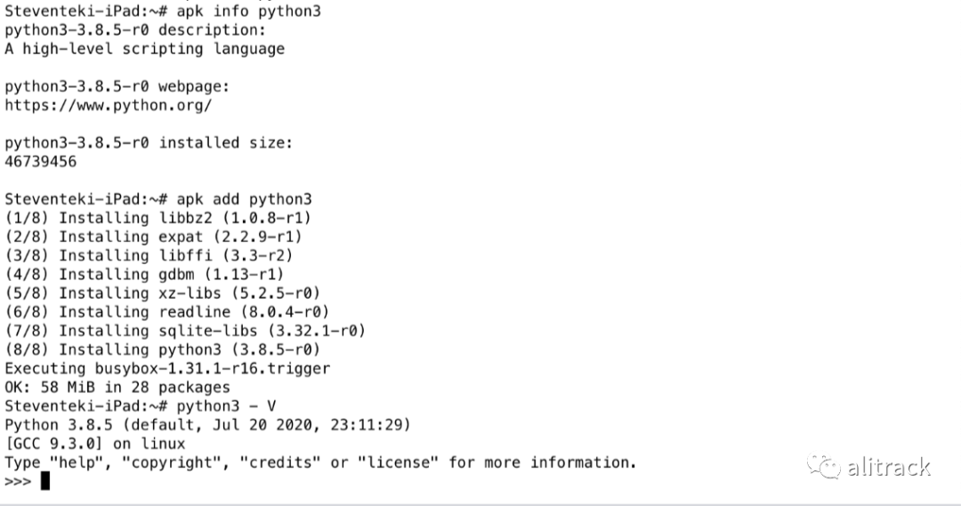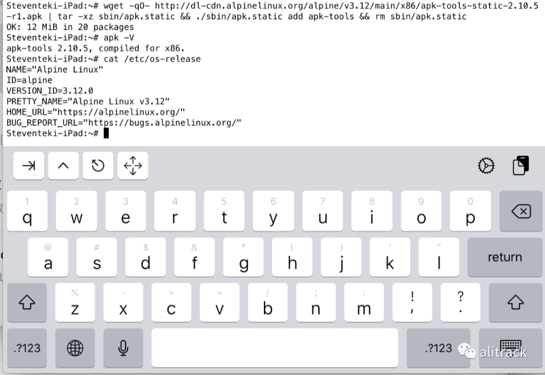 从 App Store 下载的 iSH,不带 apk(Alpine Linux 下的包管理工具),如果想安装各种程序,比如 Python,我们需要先安装它,