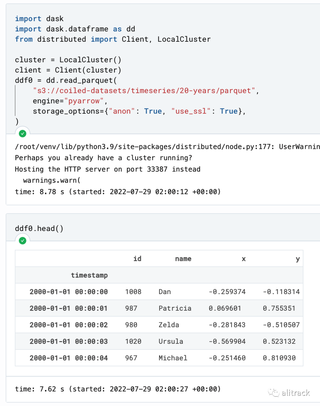 import daskimport dask.dataframe as ddfrom distributed import Client, LocalClustercluster = LocalCluster()client = Client(cluster)ddf = dd.read_parquet( "s3://coiled-datasets/timeseries/20-years/parquet", engine="pyarrow", storage_options={"anon": True, "use_ssl": True},)