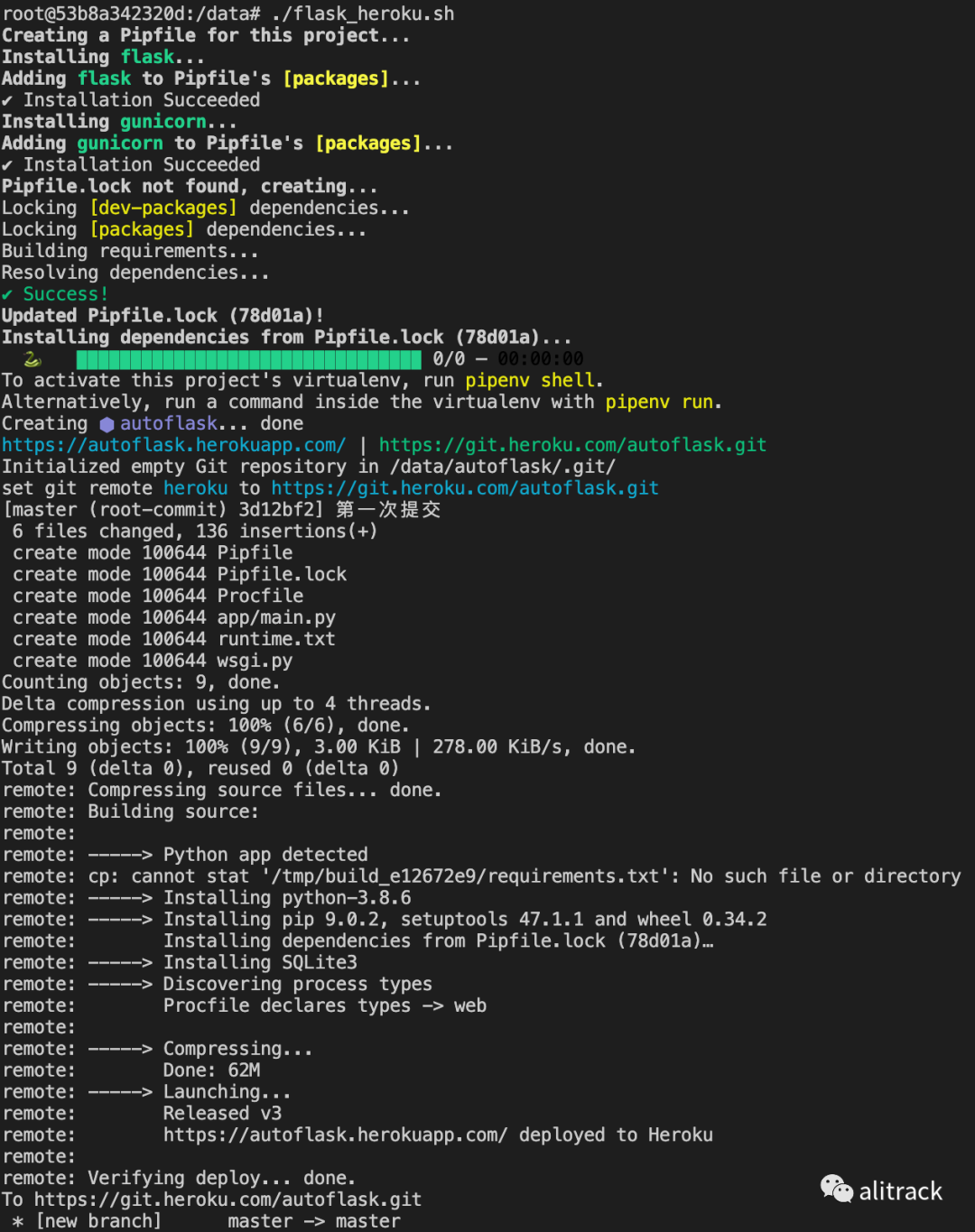 export APP=autoflaskmkdir $APP && cd $APPpipenv install flask gunicornecho 'web gunicorn wsgi:app' >Procfileecho 'python-3.8.6' >runtime.txtmkdir appcat > app/main.py <<EOFfrom flask import Flask app = Flask(__name__) @app.route("/") def home_view(): return "<h1>Welcome to Heroku</h1>"EOFcat >wsgi.py <<EOFfrom app.main import app if __name__ == "__main__": app.run() EOF# 测试#pipenv run python3 wsgi.py# app name 必须平台唯一,否则会报Name xxx is already takenheroku create $APP# 部署git initheroku git:remote -a $APPgit add .git commit -m "第一次提交"git push heroku master