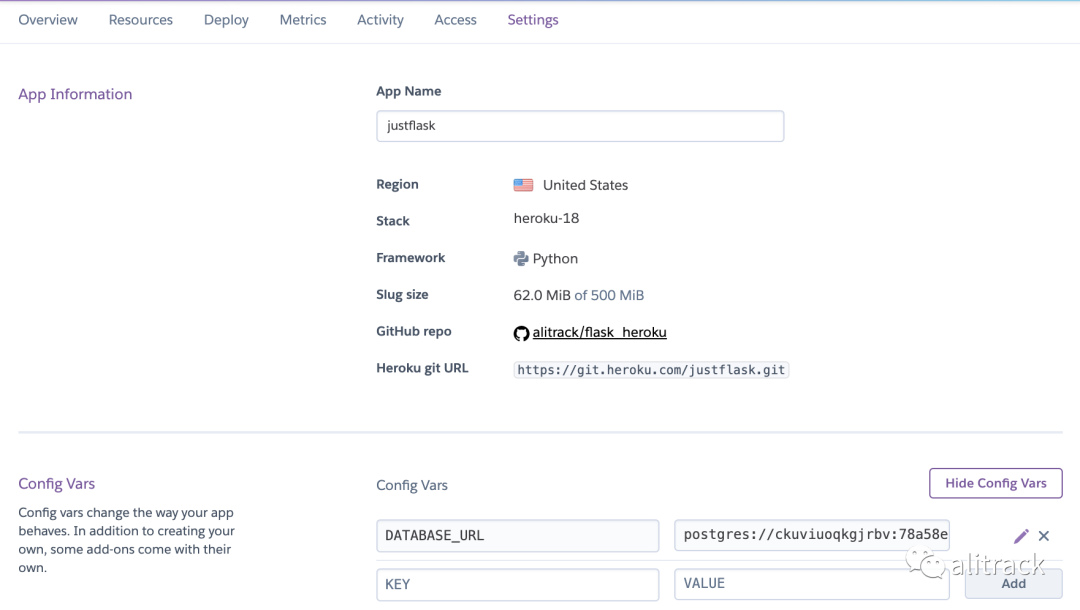 连接成功后,Postgres的信息存储在系统变量DATABASE_URL中,我们可以通过设置里获得该信息,