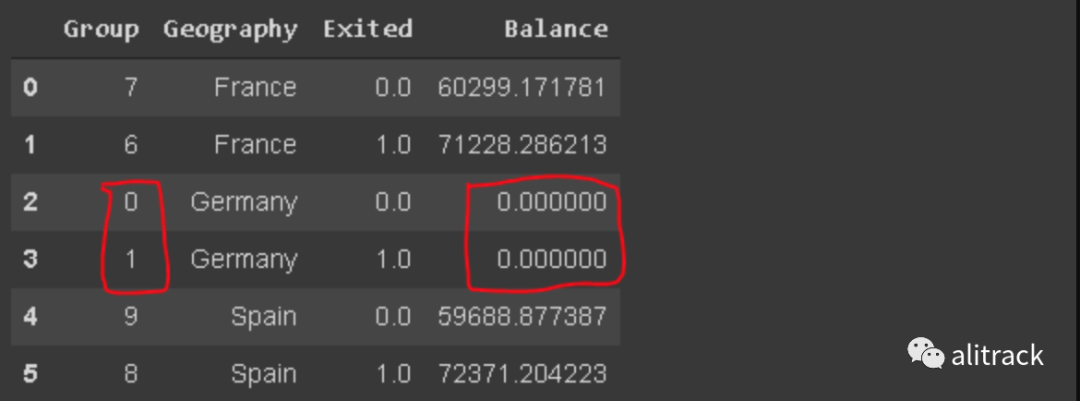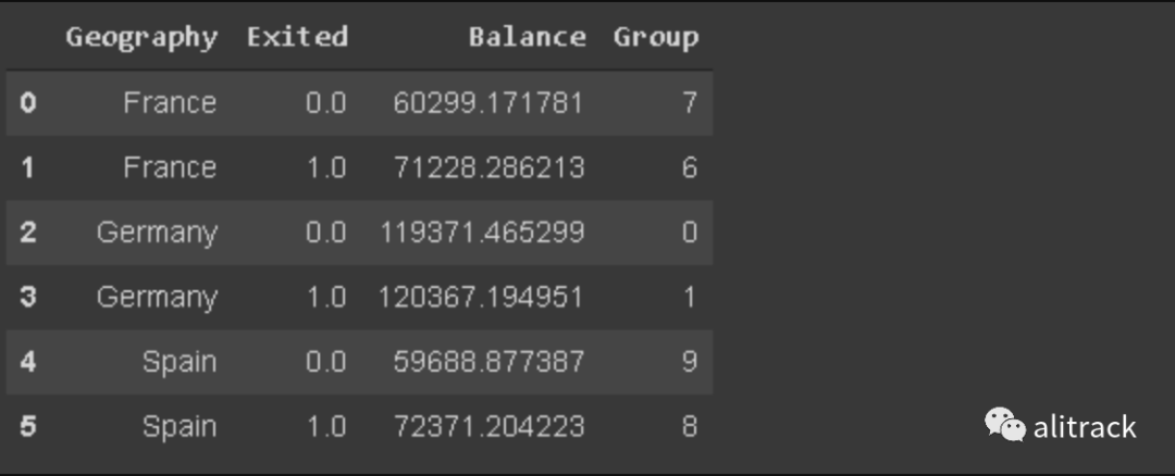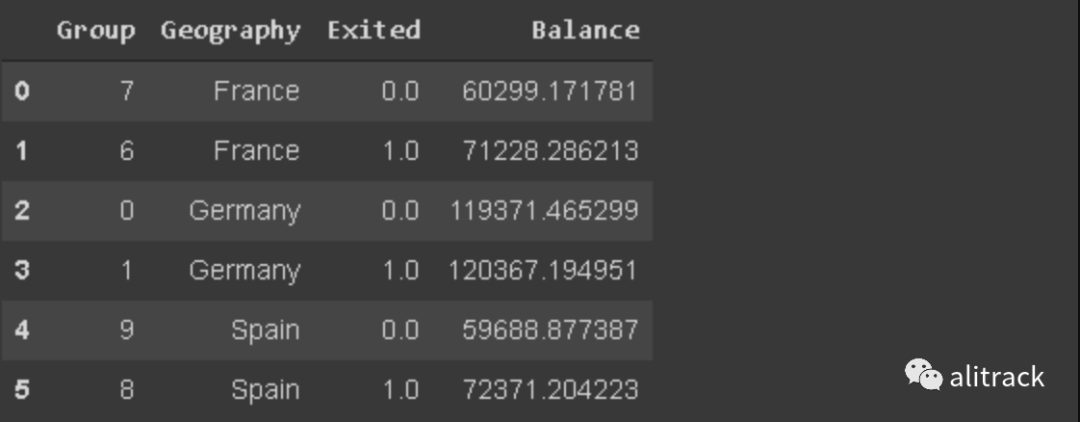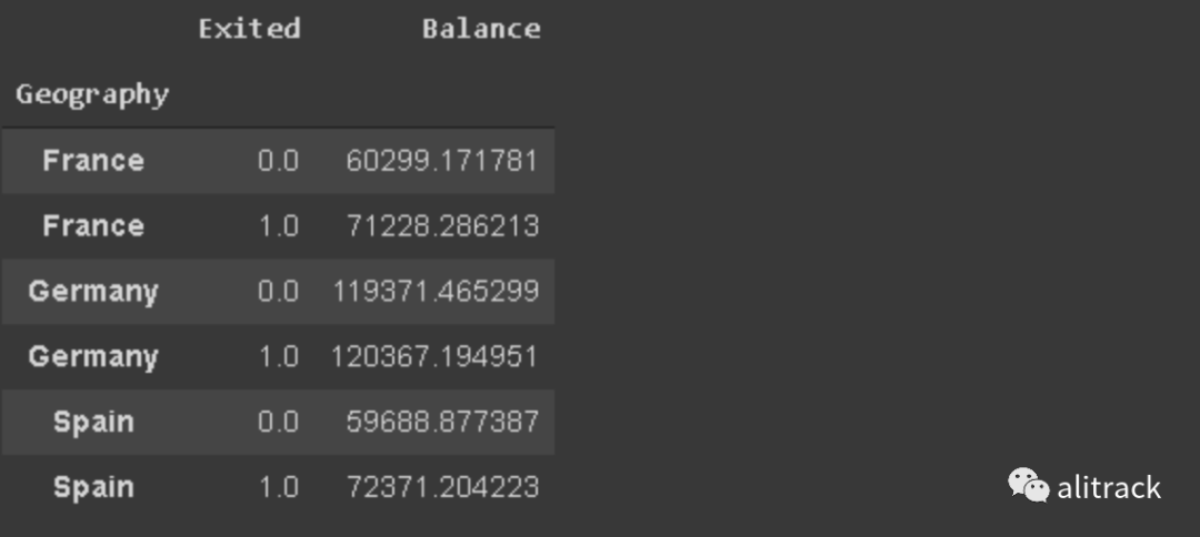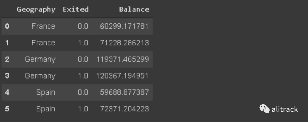 df_new = df[['Geography','Exited','Balance']]\ .groupby(['Geography','Exited']).mean().reset_index()df_new