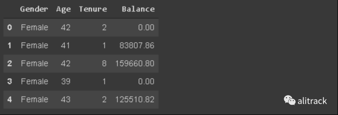 df_spec = pd.read_csv("/data/churn.csv", usecols=['Gender', 'Age', 'Tenure', 'Balance'])df_spec.head()