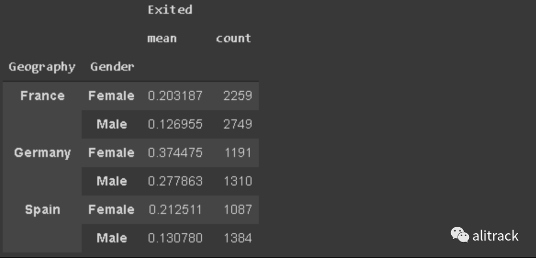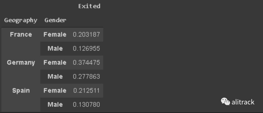 df[['Geography','Gender','Exited']]\.groupby(['Geography','Gender']).mean()
