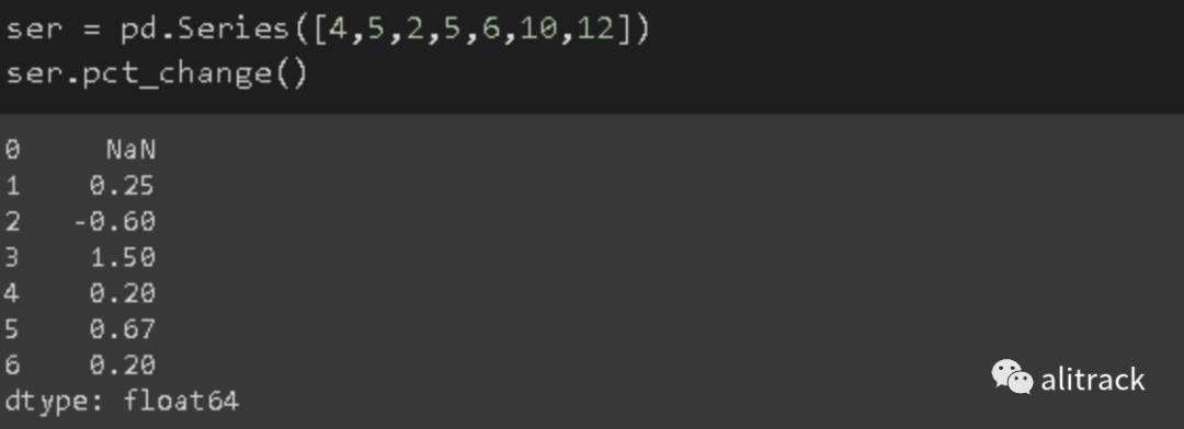 pct_change用于计算一系列值中的百分比变化。在计算元素的时间序列或顺序数组中的变化百分比时很有用。