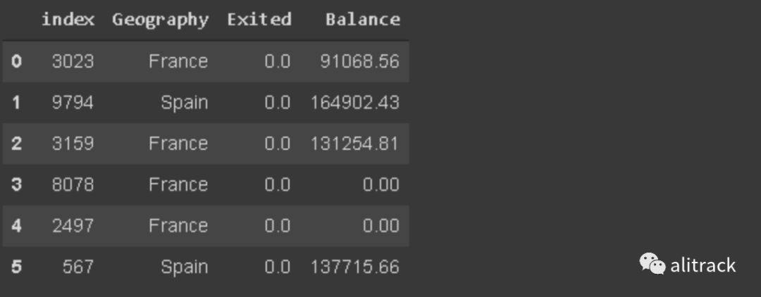 df[['Geography','Exited','Balance']]\.sample(n=6).reset_index()