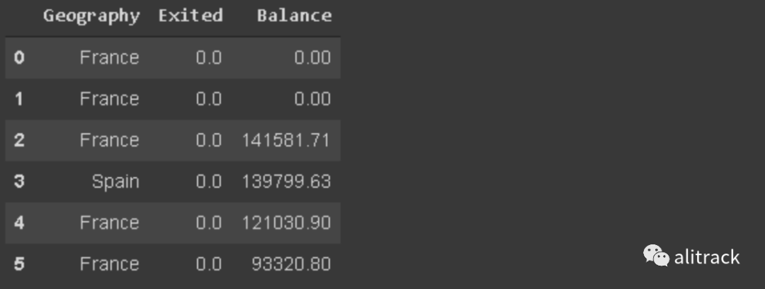 df[['Geography','Exited','Balance']]\ .sample(n=6).reset_index(drop=True)