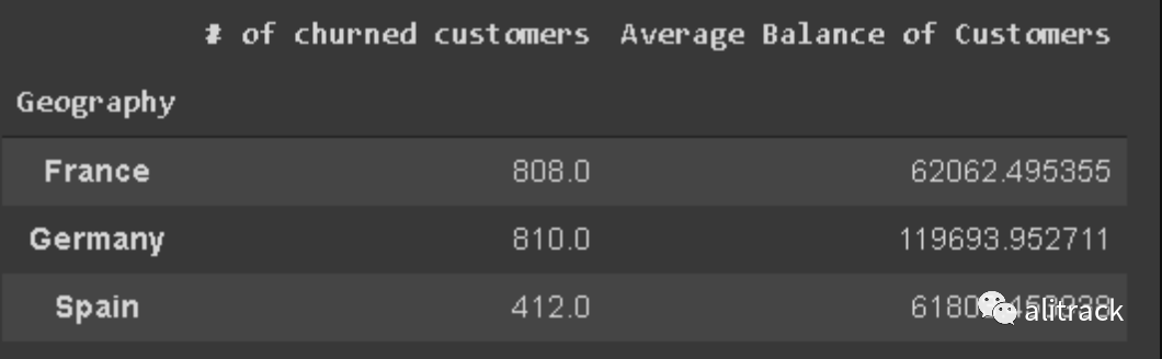 df_summary = df[['Geography','Exited','Balance']]\.groupby('Geography')\.agg({'Exited':'sum', 'Balance':'mean'})df_summary.rename(columns={'Exited':'# of churned customers','Balance':'Average Balance of Customers'},inplace=True)df_summary