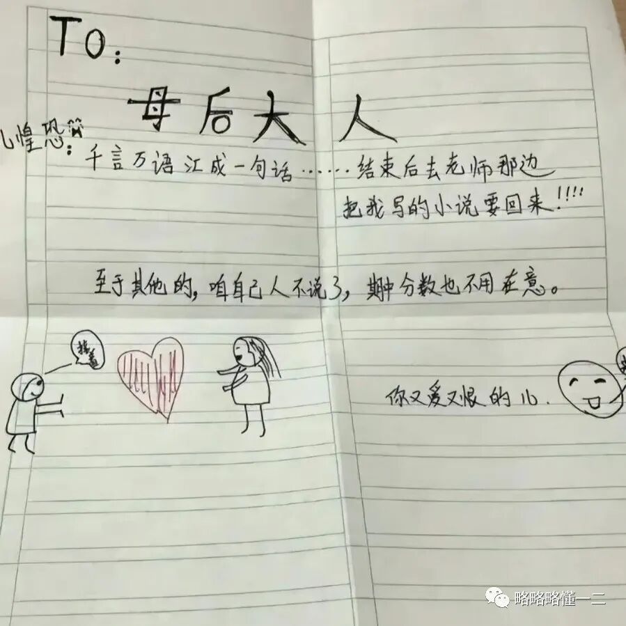 还有给妈妈“安排明明白白”的,有给妈妈留纸条让妈妈会后找老师把自己小说要回来的,还套近乎说:“至于其他的,咱自己人就不多说了”,他这么肯定妈妈会帮他要小说?还给妈妈画了表情包。