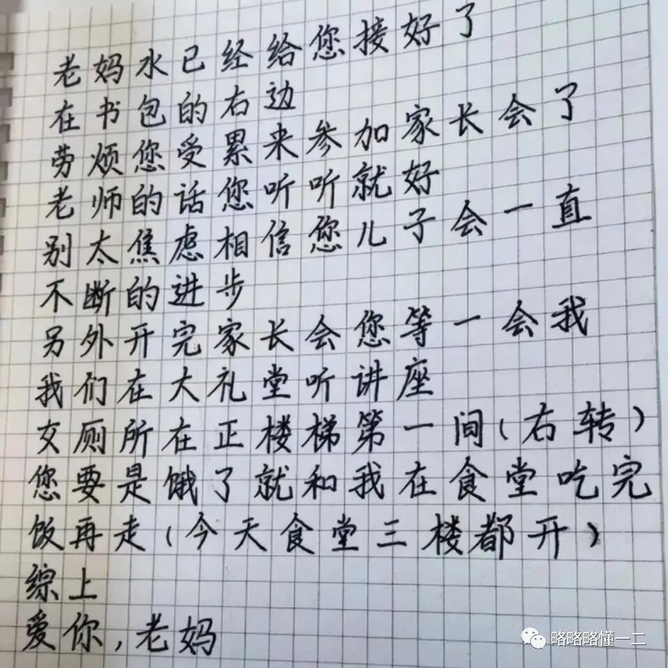 告诉妈妈家长会一切的流程,以及卫生间的位置都标注上了,还留妈妈在食堂吃饭,考虑地真周到。