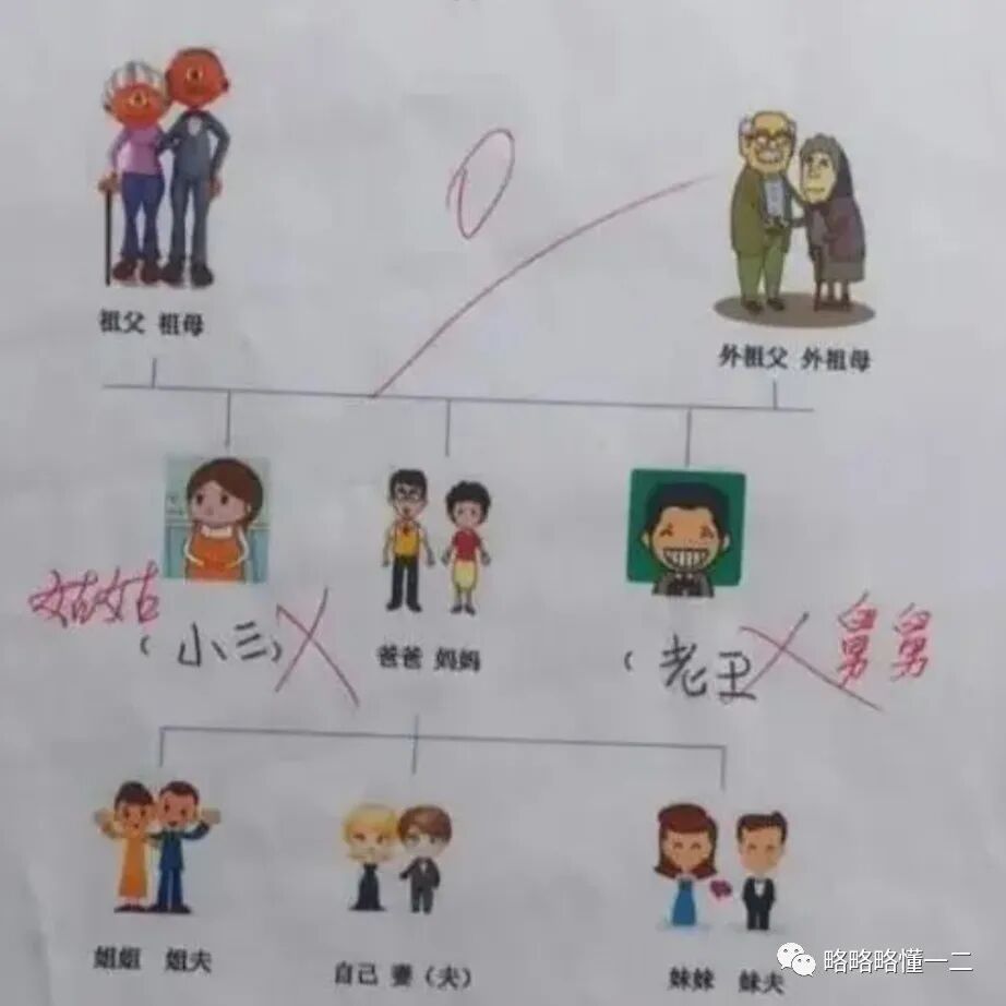 小学低年级主要是学习一些简单的字,还有生活中的一些常识等,其中就会学习到家庭的人物关系,这名小学生写出来的家庭关系让大家看的一脸吃瓜相,该说不说小学生知道的有点多了。