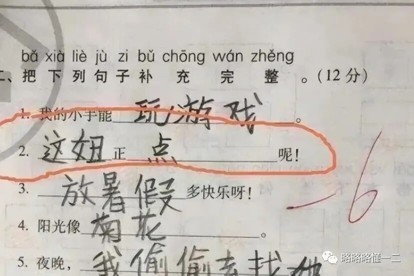 而底下还有一道题让写“夜晚……”,小学生写的是“夜晚,我偷偷去找她”,只能说小学生的思想有一点点危险,老师和家长接下来有事干了。
