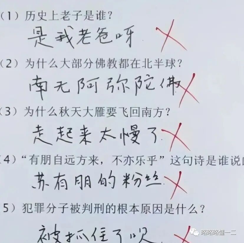 小学生对于知识的理解是比较浅显的,他们的思维方式也不一样,小学生这道大题一分没得,原因是小学生把他们都变成了脑筋急转弯类的题来回答了。