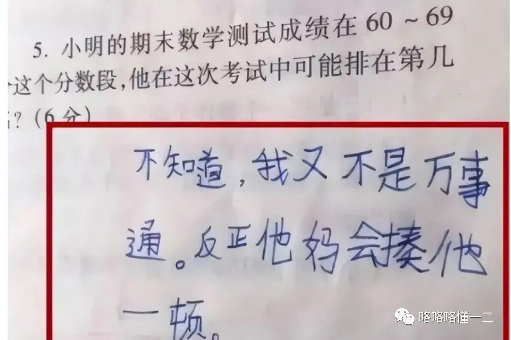 可能这名小学生看到题目后,让他联想到了自己的经历,自己考了这些分是什么样的,于是他回答说:“不知道,我又不是万事通,反正他妈会揍他一顿”,果然对待孩子的成绩,天下的妈妈都是一样的吗?