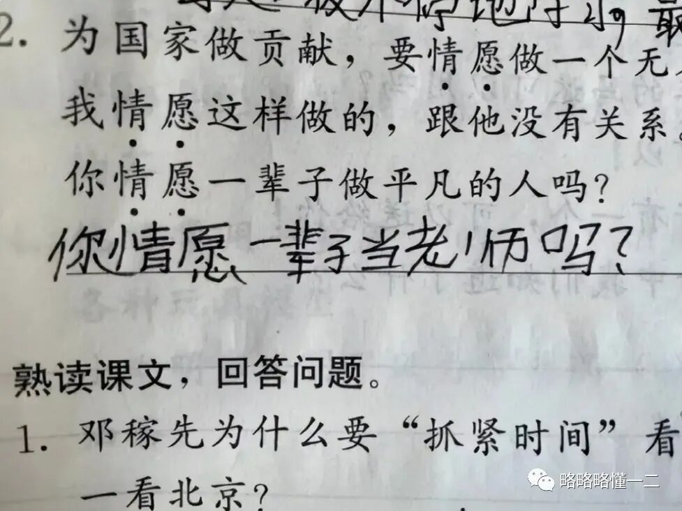 小学生这道题让用“情愿”造句,那么多可以造句的话不用,偏偏写让老师扎心的话,小学生造句写的是“你情愿一辈子当老师吗?”