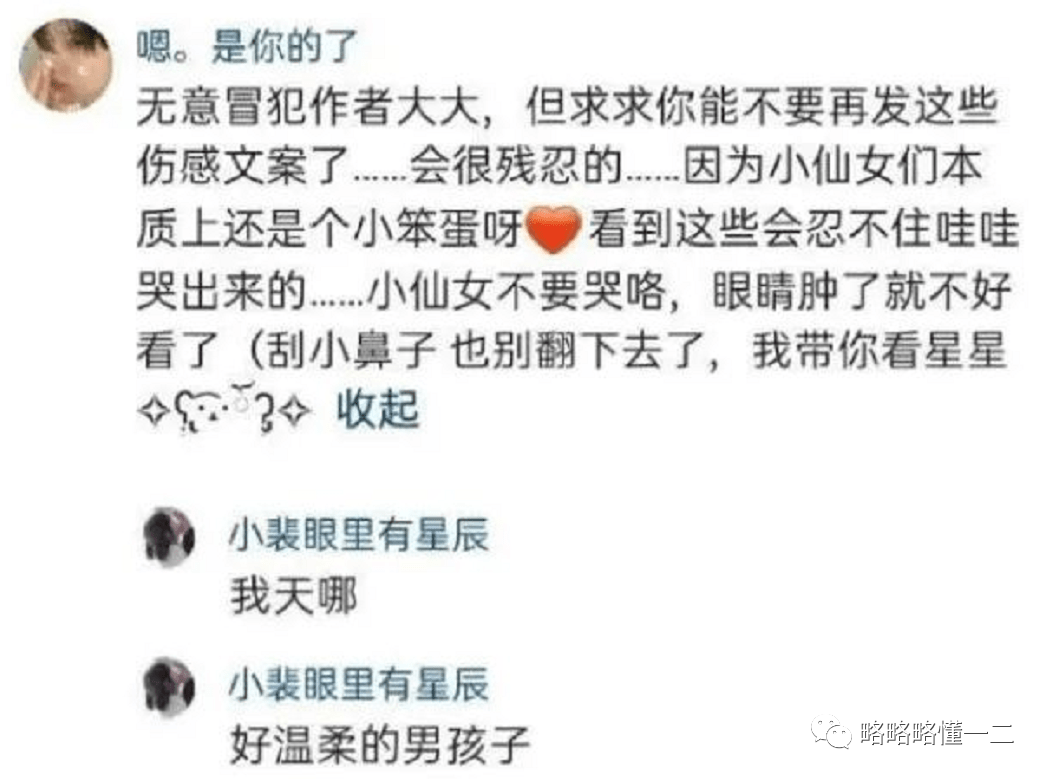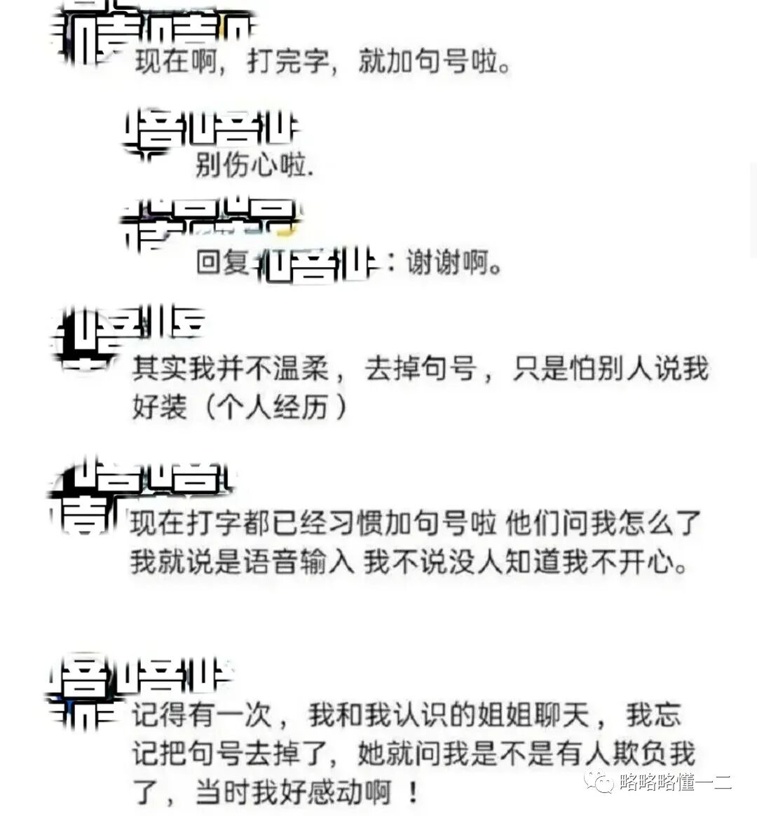 这下略略更不能理解了,加不加句号可能是个人习惯,跟温不温柔有什么关系,到底温柔在哪里了呢?成年人很难理解。